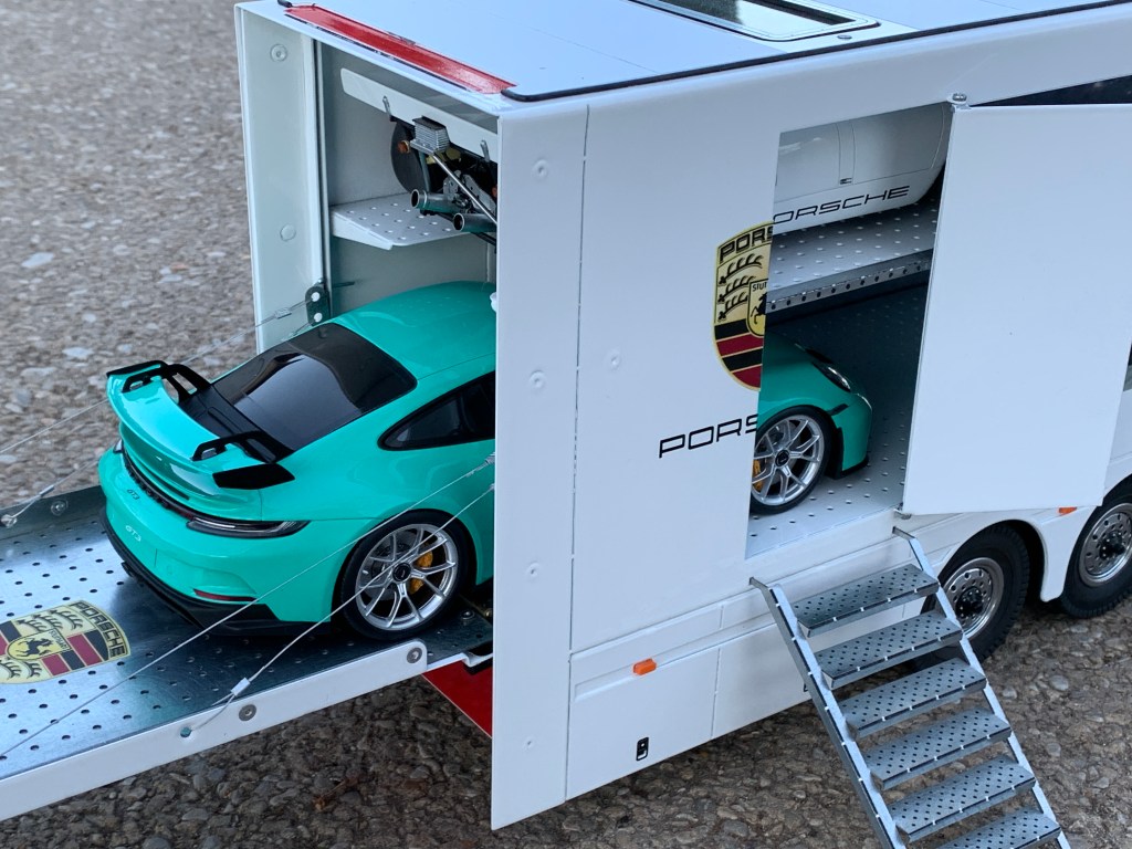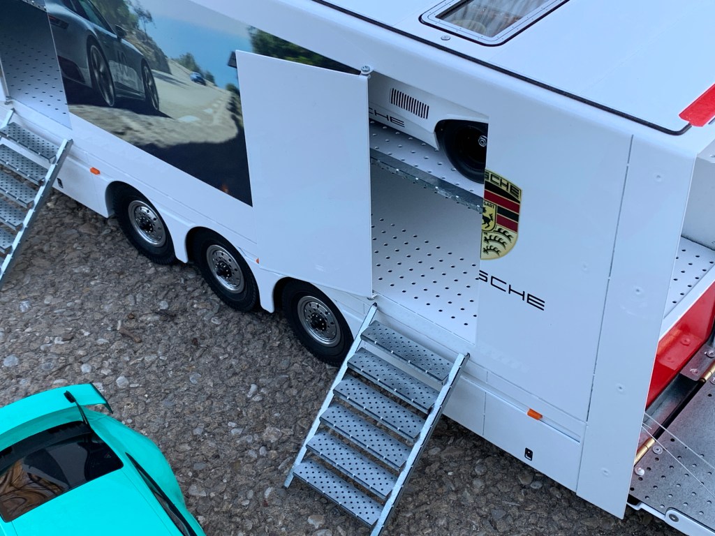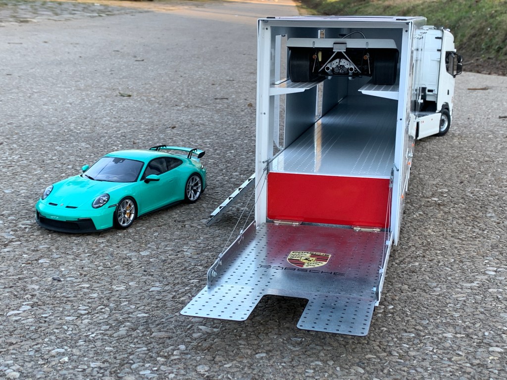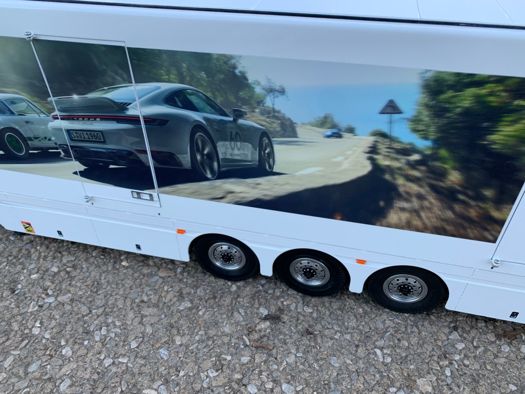 Après quelques recherches, je réussis à mettre un nom sur cette semi : c’est un modèle allemand fabriqué par Kässbohrer qui se distingue par ses deux niveaux intérieurs, ses portes latérales et son porte-à-faux arrière étirable. Un camion de ce type serait l’écrin idéal pour abriter quelques-unes de mes Porsche au 1/18ème !