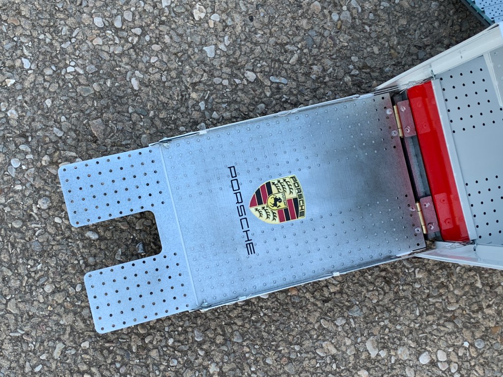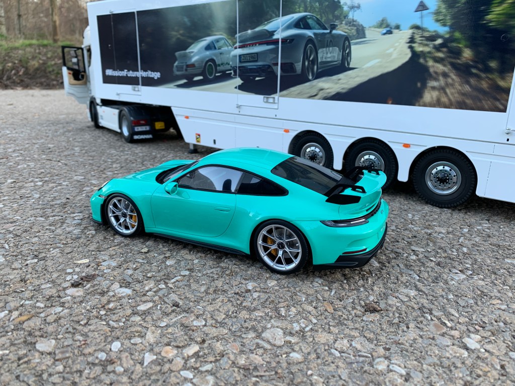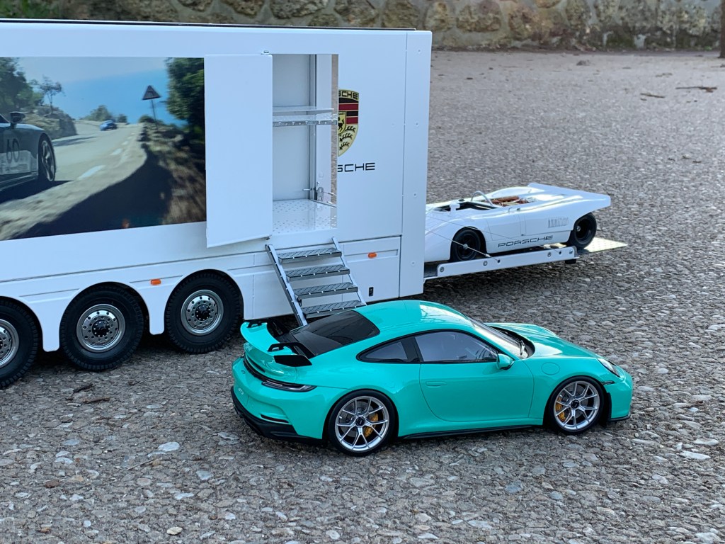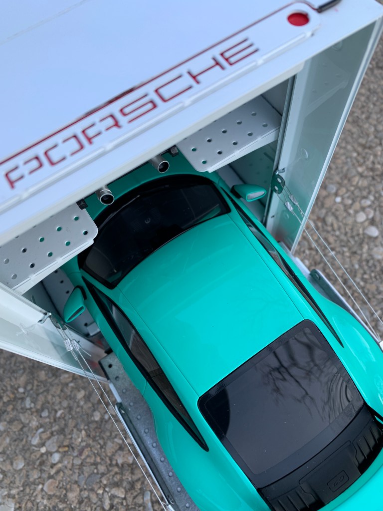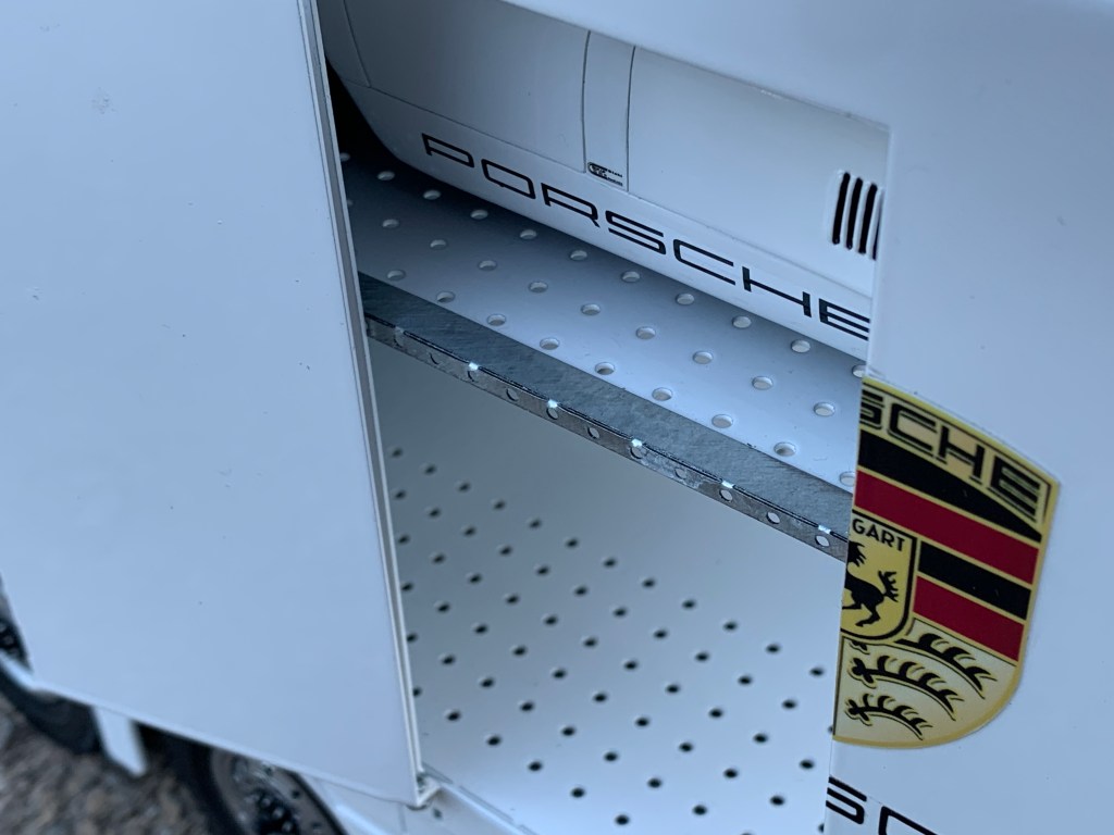 Après quelques recherches, je réussis à mettre un nom sur cette semi : c’est un modèle allemand fabriqué par Kässbohrer qui se distingue par ses deux niveaux intérieurs, ses portes latérales et son porte-à-faux arrière étirable. Un camion de ce type serait l’écrin idéal pour abriter quelques-unes de mes Porsche au 1/18ème !