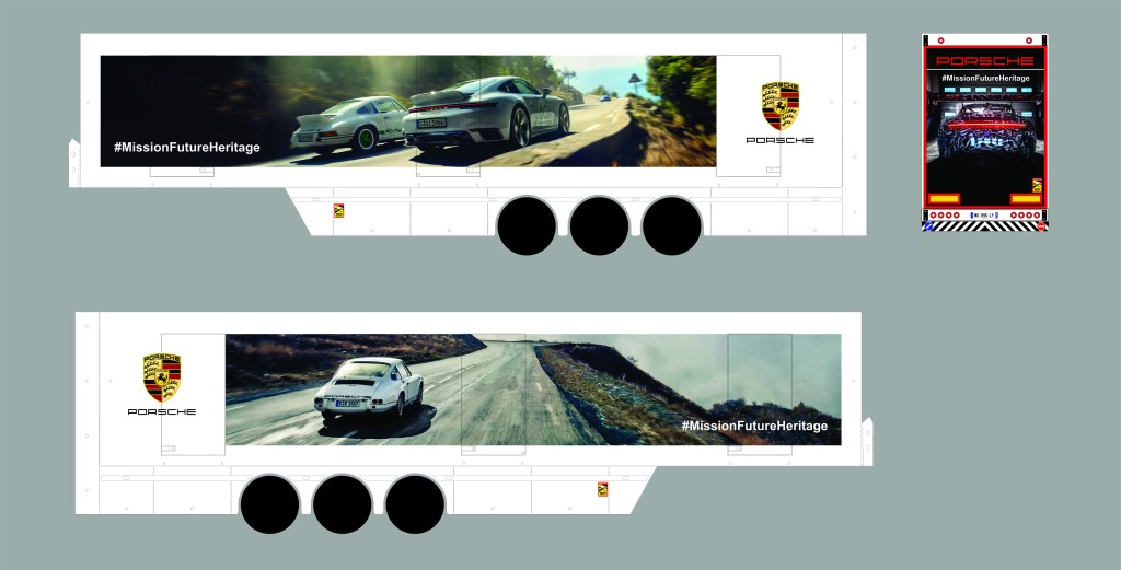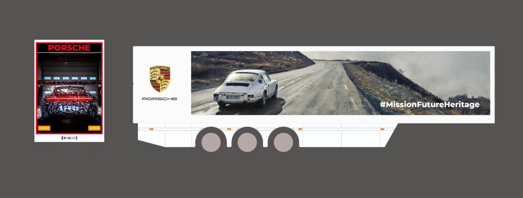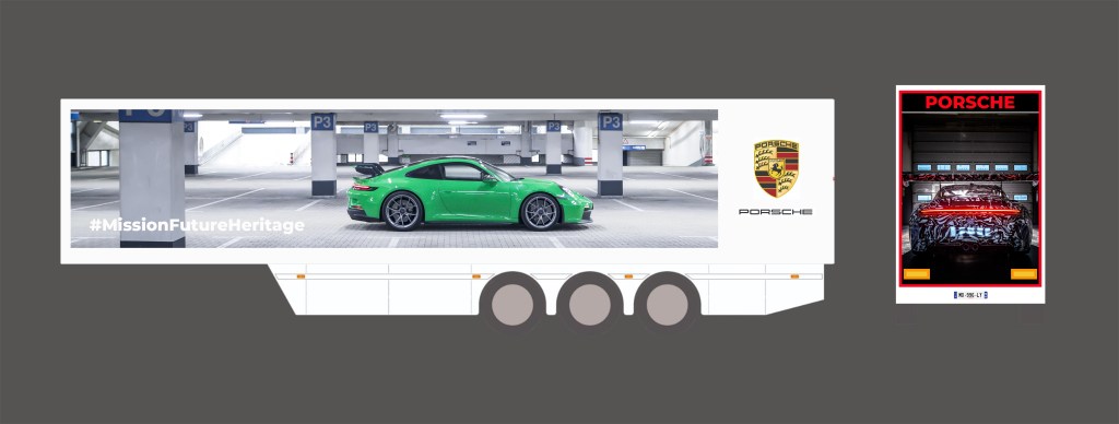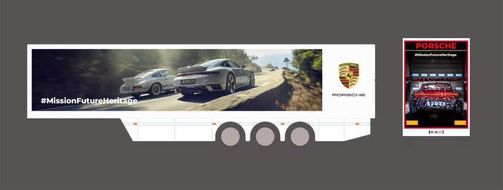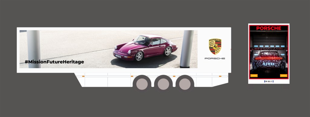 Une fois ces éléments validés, il nous faut définir la décoration de la semi. Prenant exemple sur le camion officiel de Porsche, je choisis d’intégrer de grands visuels sur les flancs avec la mention #MissionFutureHeritage ainsi que le logo de la prestigieuse marque. N’ayant aucune représentation de l’arrière de la semi, je décide d’apposer à cet endroit un visuel couvrant l’intégralité de la surface disponible. Ce visuel sera très rapidement trouvé, il s’agit d’une vue arrière d’une GT3 Cup que je trouve magnifique !