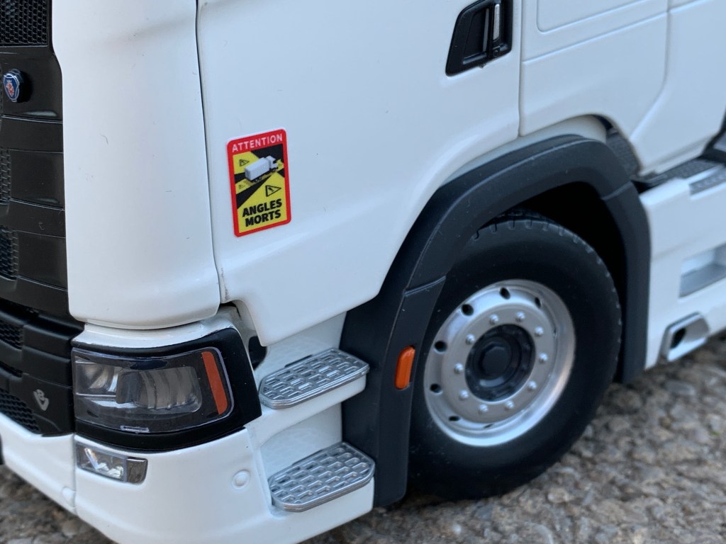 Prenons le temps de détailler la semi-remorque. Assemblée à la main, elle est composée de nombreuses plaques métalliques découpées au laser. La peinture blanche qui la recouvre bénéficie d’une belle profondeur. Elle est bien appliquée.