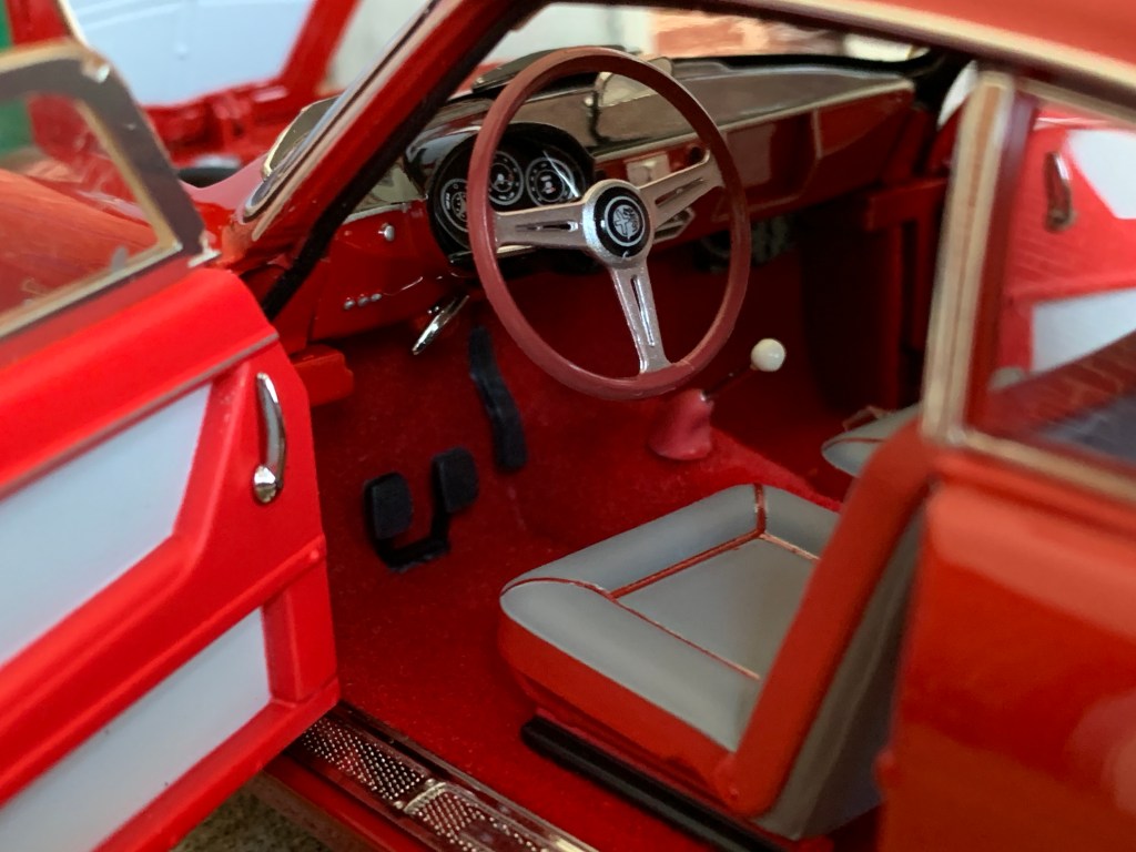 Le soin apporté par Kyosho à cette réalisation se poursuit à l’intérieur. Nous retrouvons l’habitacle caractéristique de la Giulietta Sprint avec ses beaux compteurs ronds et son volant en bois.