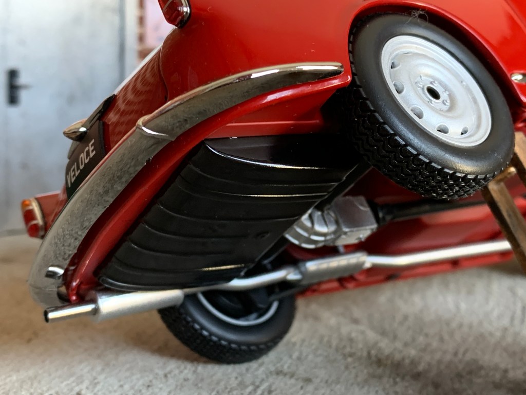 Le châssis est détaillé et laisse apparaitre de nombreux organes mécaniques. Les jantes – présentées sans enjoliveur central – sont bien réalisées tout comme les pneumatiques.