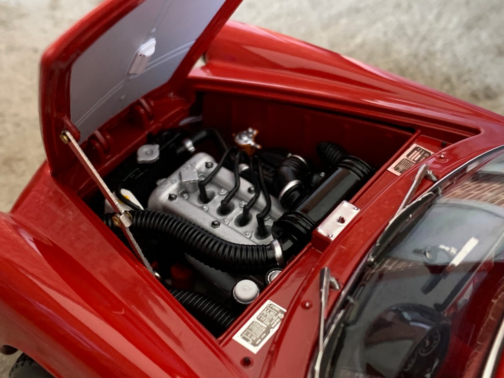 La capot moteur donne accès au célèbre bloc de l’Alfa Romeo. Ce dernier est détaillé et proche de la réalité. Nous retrouvons sur la baie de pare-brise la plaque d’identification de la voiture, un petit détail qui montre tout le soin apporté par Kyosho à cette réalisation.