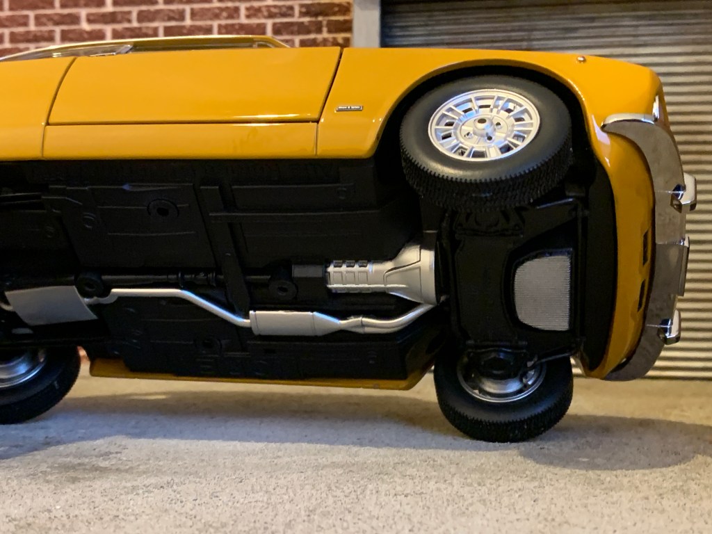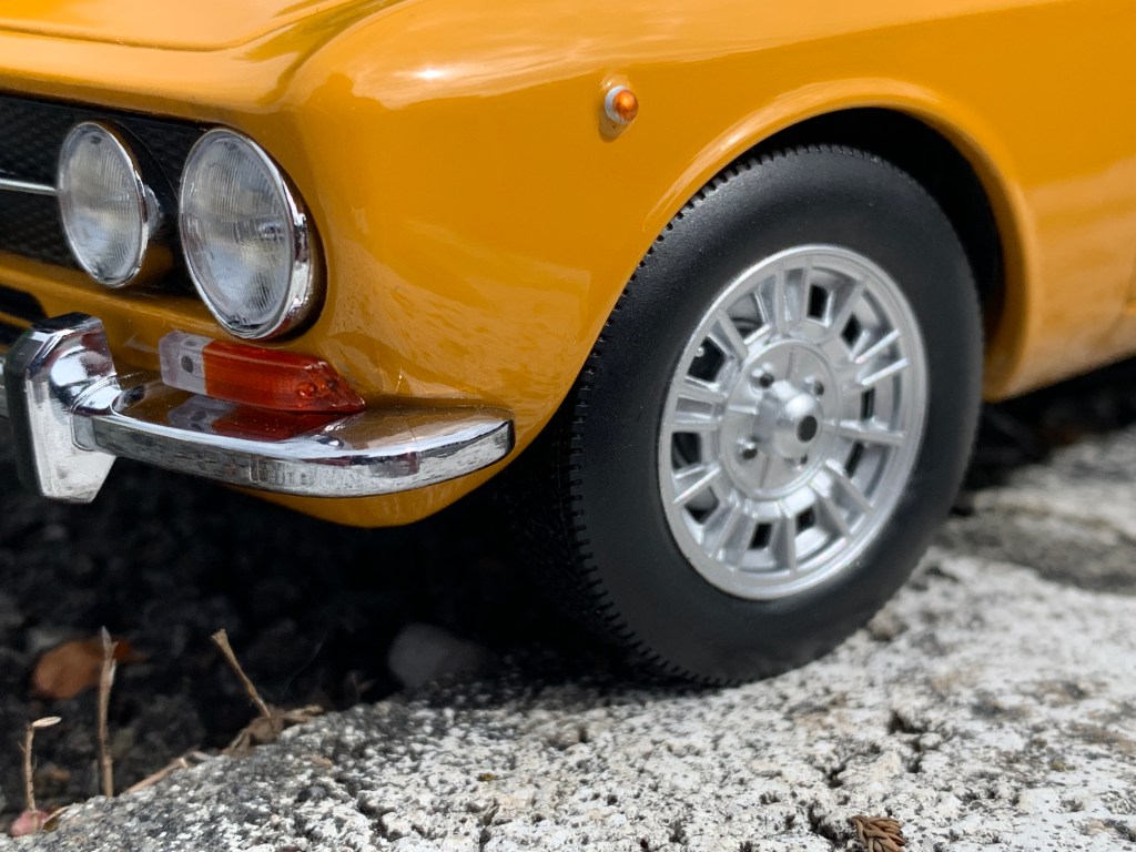 Les jantes pourront en surprendre certains. En effet, Norev a fait le choix de ne pas reproduire les jantes en tôles recouvertes d’un enjoliveur central qui équipaient la 1750. Le fabricant a préféré reproduire des modèles disponibles à l’époque au rayon des accessoires : des jantes en aluminium de la marque FPS dont le dessin ressemble à celui des jante équipant la célèbre Dino 246. Le résultat est séduisant.