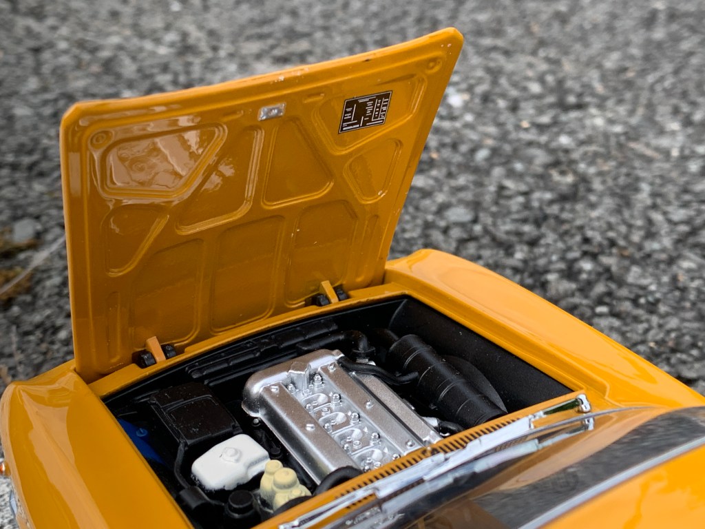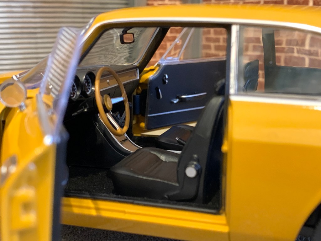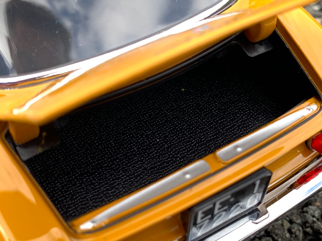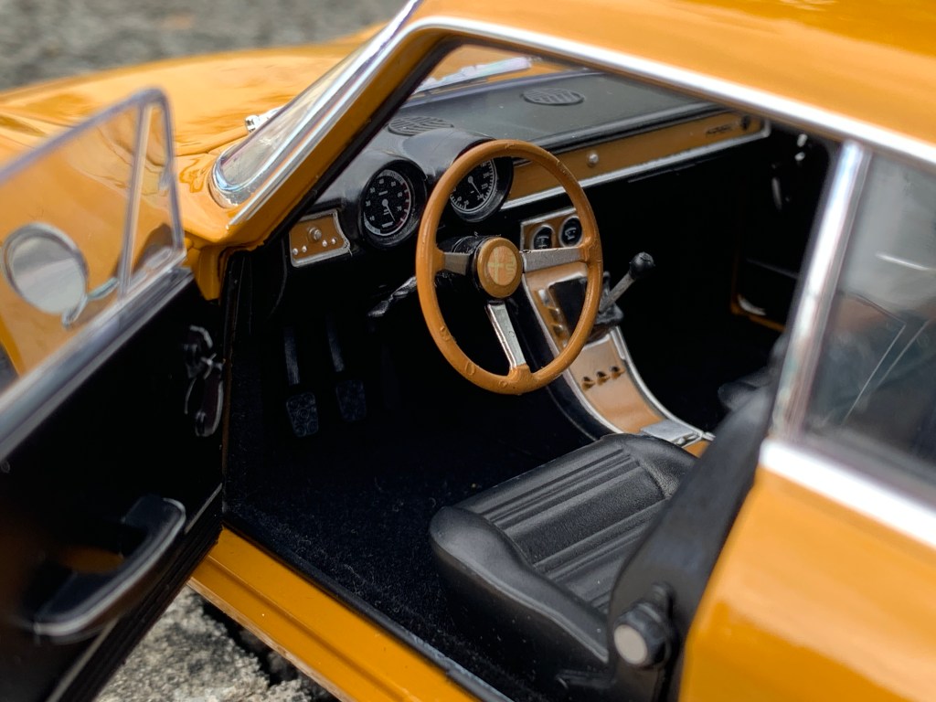Le coupé est recouvert d’une belle couleur jaune très seventies dénommée Giallo ocra. La peinture est bien appliquée.