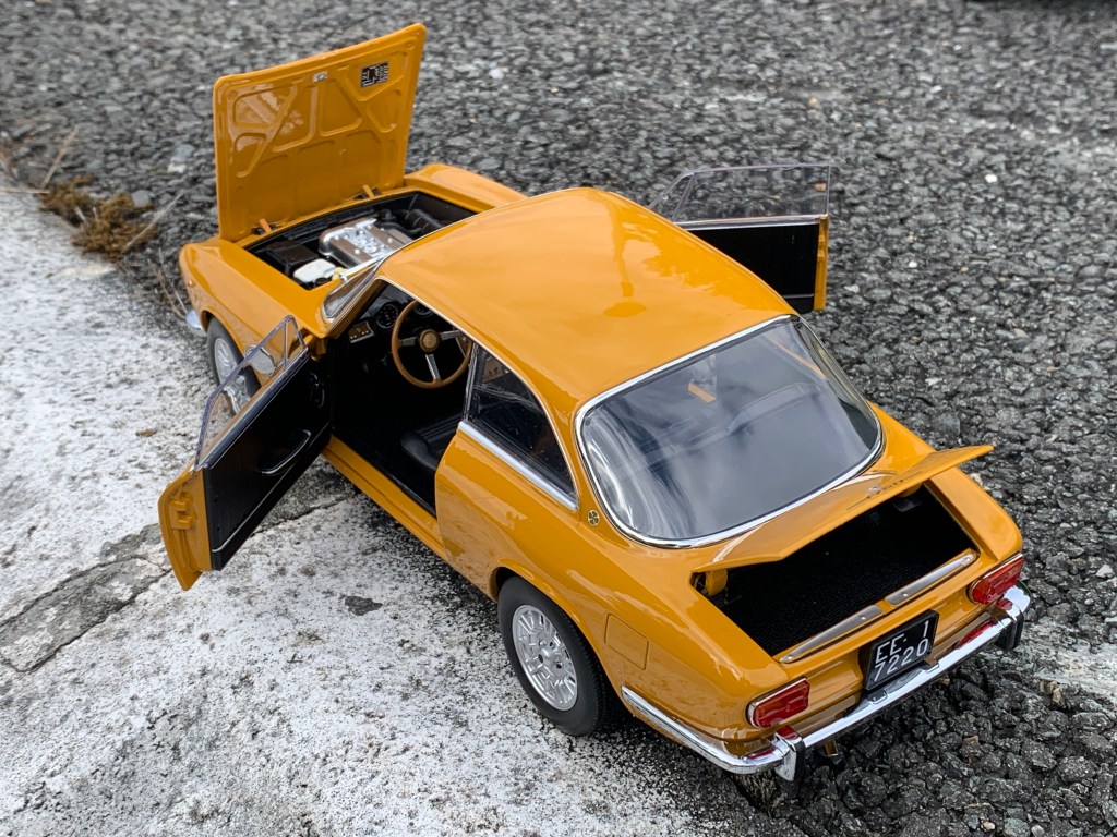Réalisée en métal, la Giulia de Norev reproduit avec une grande fidélité la jolie silhouette du coupé dessiné par Bertone. Nous retrouvons sur les flancs les deux arêtes longitudinales qui dynamisent sa ligne ainsi qu’à l’avant, la belle calandre agressive équipée de quatre optiques.
