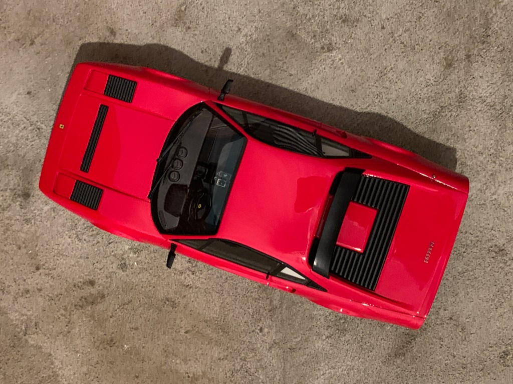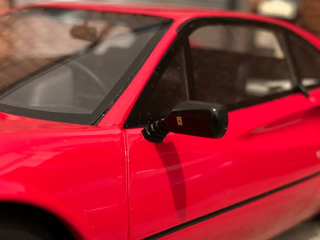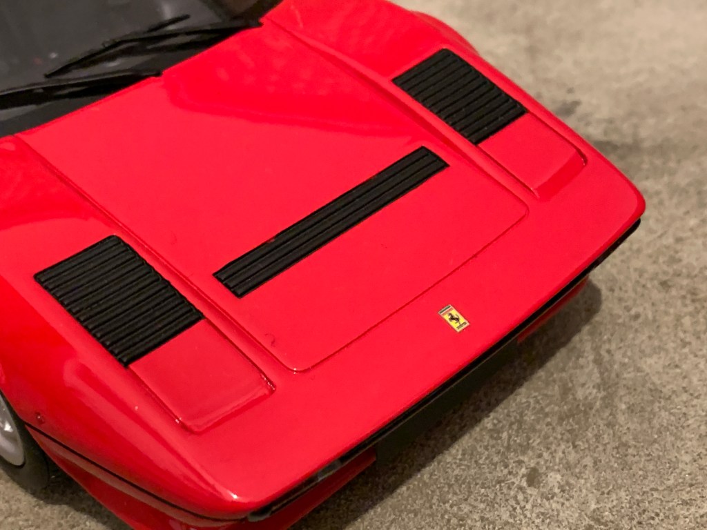 De nombreuses pièces rapportées viennent enjoliver la miniature. Nous retrouvons bien sûr les nombreuses prises d’air – qui auraient mérité d’être ajourées, comme la jolie grille de calandre chromée -, deux rétroviseurs qui arborent le logo Ferrari, des échappements réalistes et une antenne radio repliée sur l’aile arrière droite.