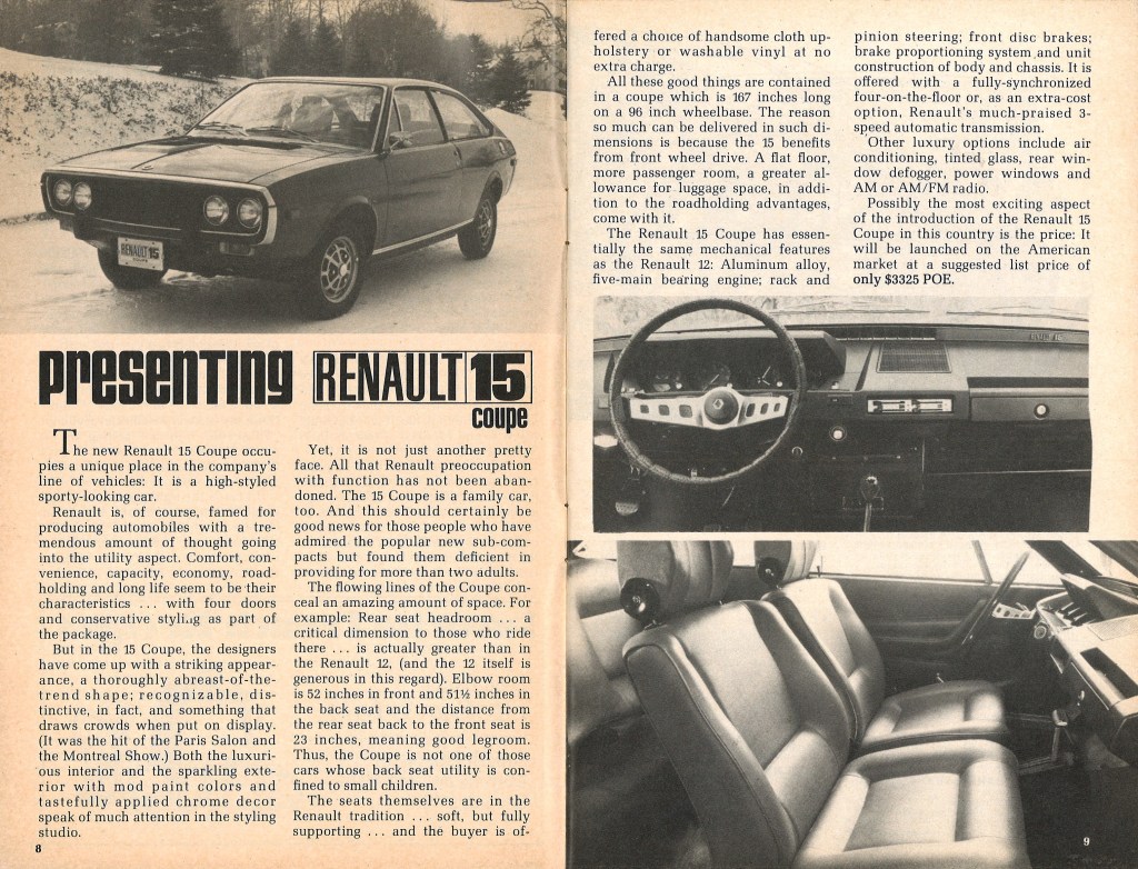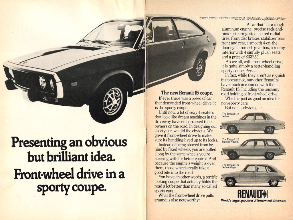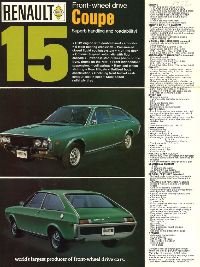 Les Renault 15 et 17 font leur apparition en Amérique du Nord en 1972, aux côtés des Renault 12 et 16.