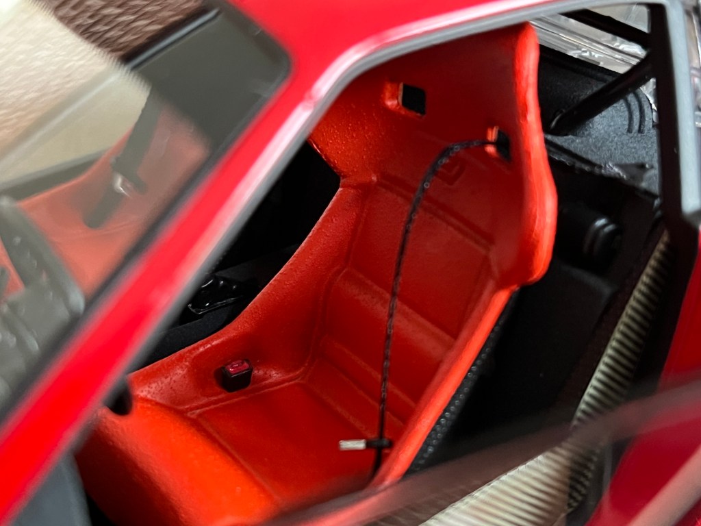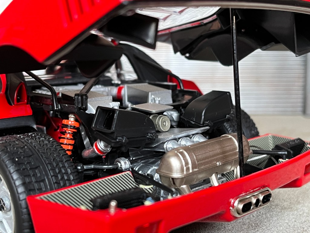 Principal avantage de cette F40, ses ouvrants. Les portières, les capots avant et arrière et même, les trappes à essence sont fonctionnels ! La réalisation de ces éléments est de bonne facture et toutes ces pièces bénéficient d’un ajustement parfait.