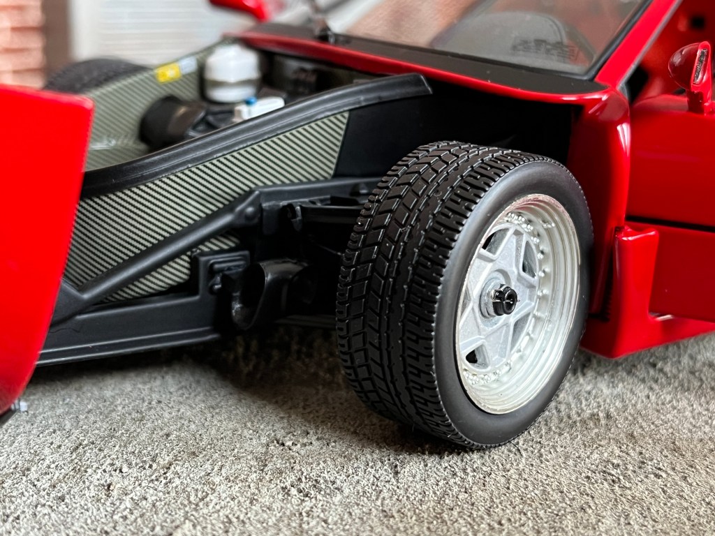 Le châssis est également bien réalisé. Nous retrouvons sur ce dernier un petit bouton permettant d’actionner les phares escamotables de la F40.