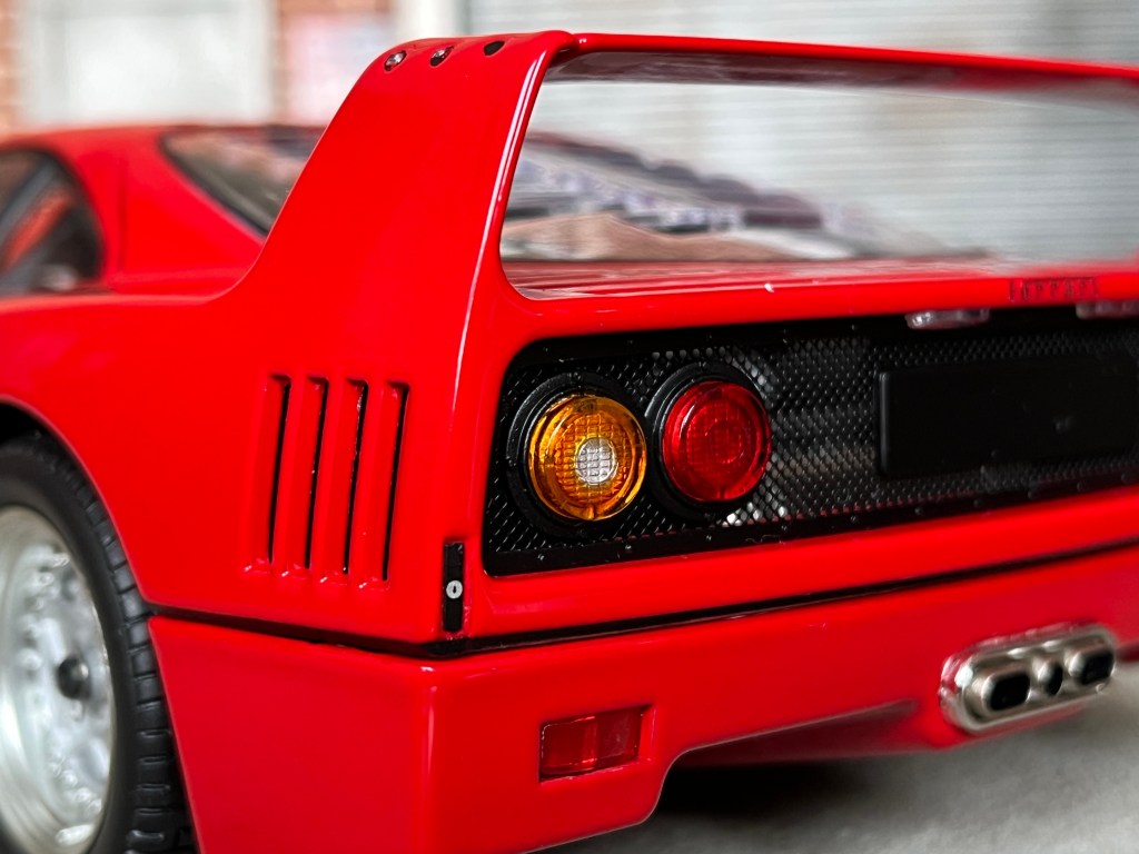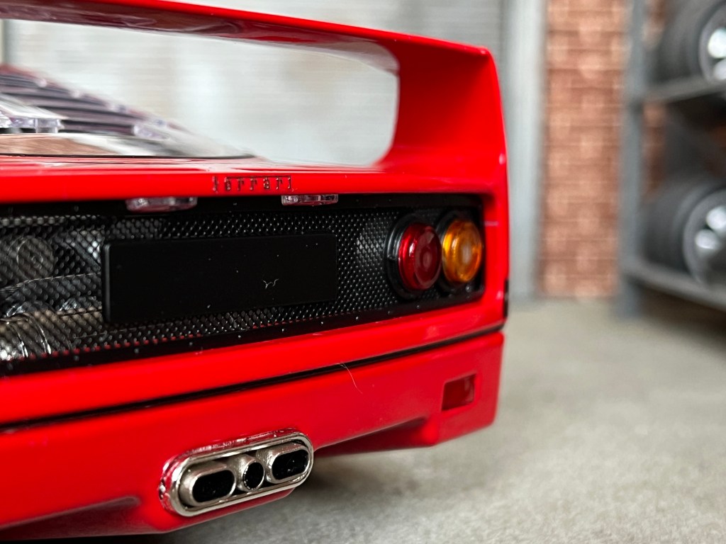 Je n’ai qu’un reproche à formuler, la présence d’un enjoliveur chromé encadrant les trois sorties d’échappement. Un accessoire incongru que je ne retrouve sur aucune photo de la F40 à l’échelle Un…