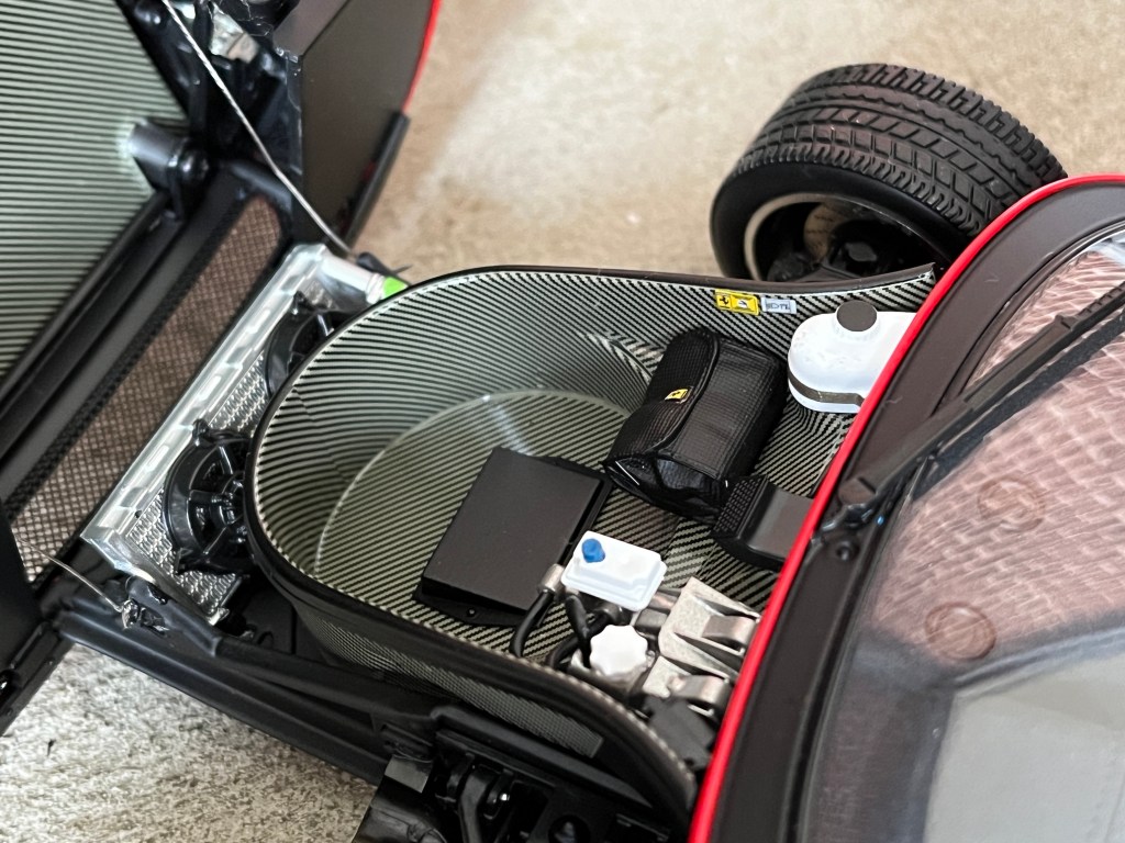 A l’avant, le capot bascule et permet d’admirer le coffre ainsi que les nombreux éléments mécaniques de la F40. Le résultat est vraiment superbe ! Les plus attentifs noteront la présence de la trousse à outils (de couleur noire, elle était grise sur les modèles 2007) ainsi que la reproduction parfaite de quelques étiquettes constructeur. Grande nouveauté par rapport aux modèles réalisés par Kyosho en 2007, l’application d’un revêtement imitant le carbone sous le capot.