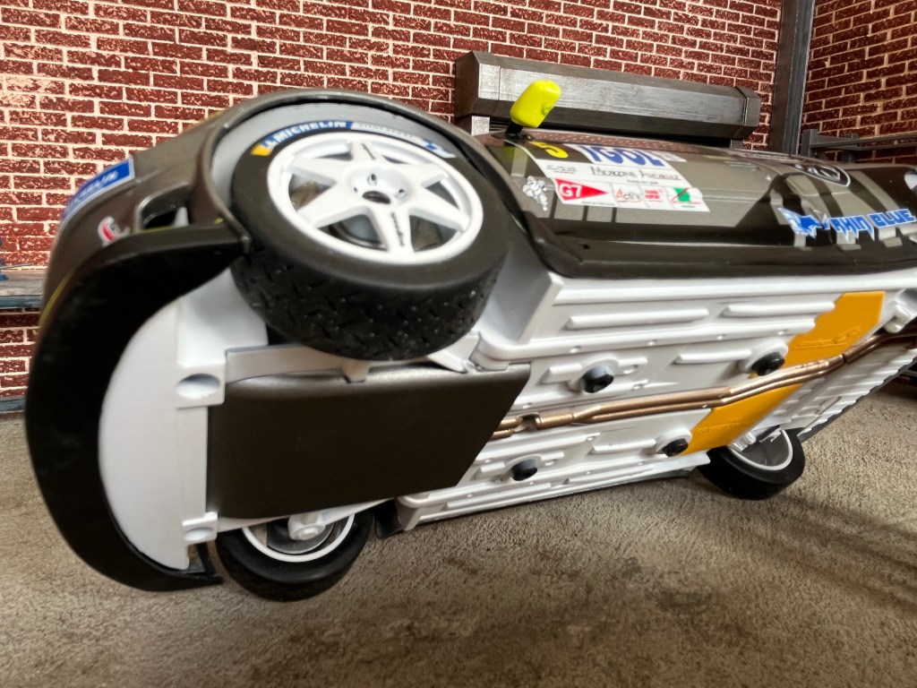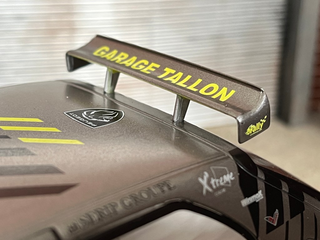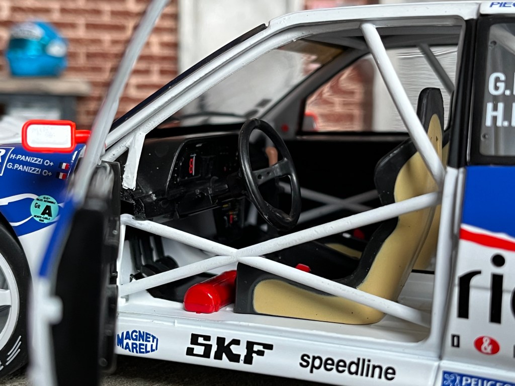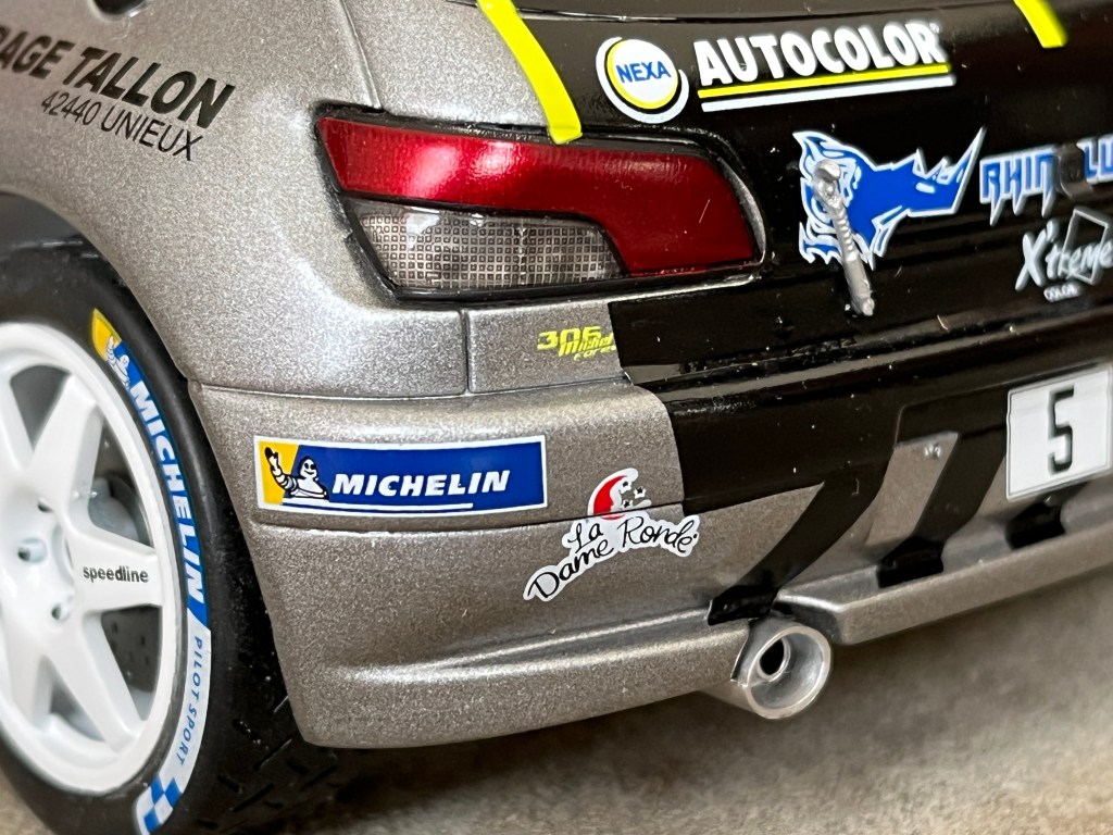 Les jantes et les pneumatiques sont également fidèles, tout comme le châssis qui bénéficie d’un soin particulier. Ce dernier est blanc, comme l’était le châssis de toutes les 306 Maxi.