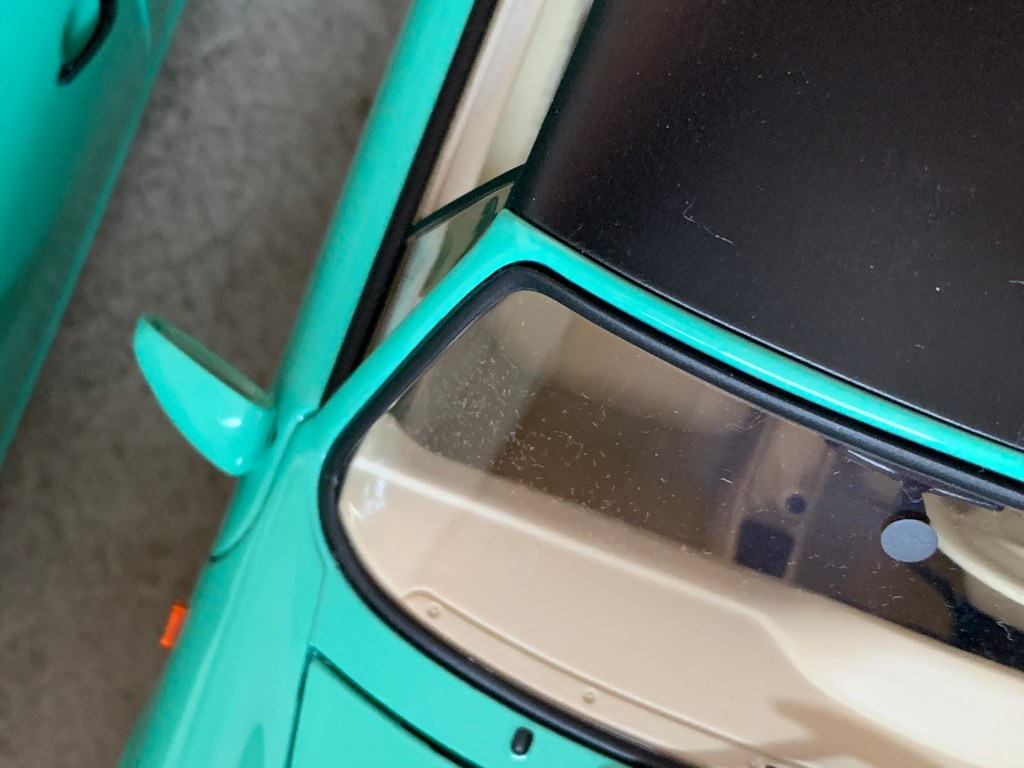 Malgré cela, quelques défauts isolés peuvent parfois apparaître. Sur les neuf versions qui sont passées entre mes mains, deux présentaient une anomalie : une trace de peinture noire sur le pare-chocs avant de la Targa (👇voir photo ci-dessous), un moteur mal clipsé et des vitres latérales non alignées sur le coupé de couleur Vert Signal.
