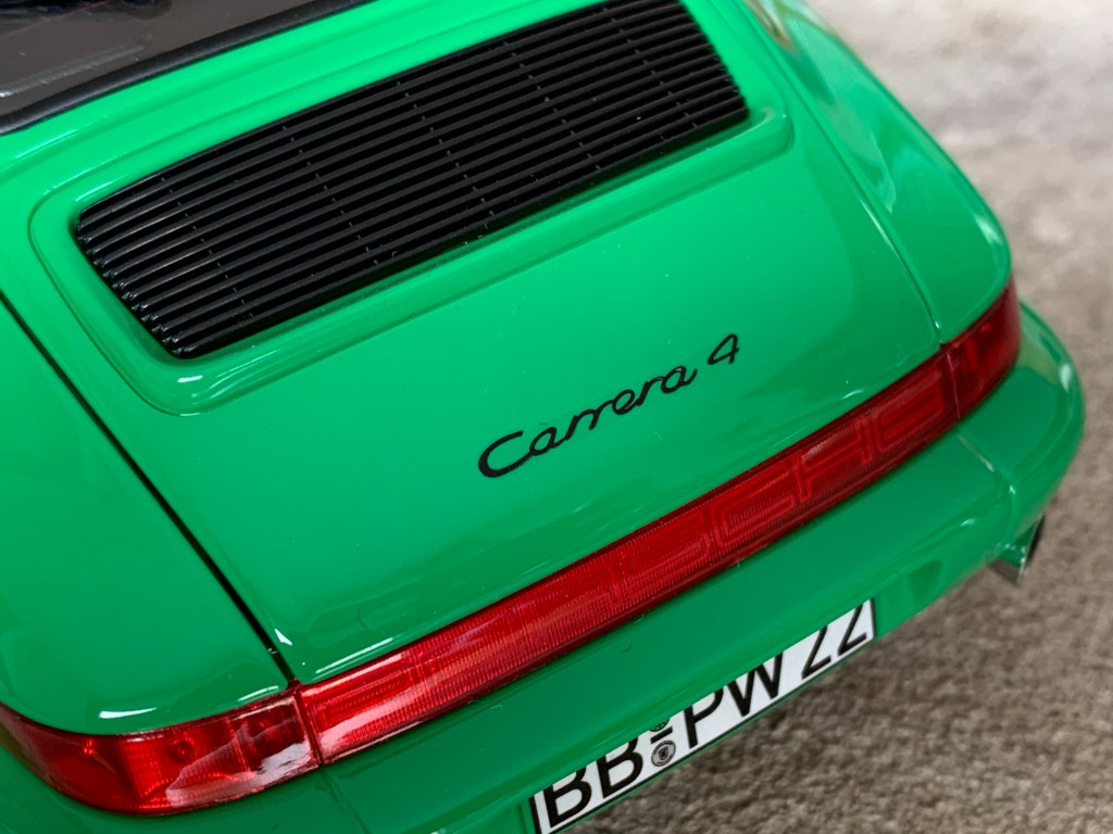 Ce détail n’a pas été pris en compte sur les premières 964 présentées par Norev. Depuis, le fabricant a corrigé ce point et le rétroviseur droit est désormais fixé au bon endroit sur les toutes dernières 964 présentées par Norev (Carrera 2 Mint Green, Carrera 4 Vert Wimbledon, Carrera 4 Targa Argent et Carrera 2 jaune).