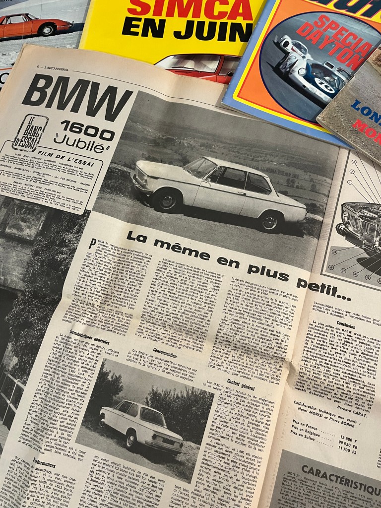Cette 1600-02 est essayée par Bernard Carat dans le numéro 405 de L’Auto-Journal publié le 23 juin 1966. Voici ce que le journaliste écrivait à propos de la Jubilé : « Pour le cinquantième anniversaire de sa création, B.M.W. a modifié profondément sa gamme de voitures et a présenté une série impressionnante de nouveaux modèles tout en abandonnant complètement la petite 700 délaissée aussi par la clientèle. Les nouvelles 2000 prendront petit à petit la place des 1800 tandis qu’apparait sur le marché un modèle plus léger et plus économique, la 1600 deux portes. […] Le moteur est toujours un quatre cylindres en ligne. […] Il développe 96 ch SAE à 5800 tr/mn (85 ch DIN ndlr), soit une puissance légèrement supérieure à celle de l’ancien groupe 1 600 cm3. […] Sur l’anneau de Montlhéry, […] nous avons atteint, le conducteur étant seul à bord, la vitesse réelle de 163,2 km/h […] et l’on voit qu’en vitesse pure, la B.M.W. 1600 se place remarquablement dans sa cylindrée. Sur bonne route, cette vitesse de pointe élevée peut être soutenue longtemps sans difficulté et le moteur ne donne jamais l’impression d’être poussé à bout ni de tourner à régime trop élevé. […] La B.M.W. 1600 a prouvé qu’elle tenait aussi bien la route que les autres modèles de la marque et que sa stabilité à grande vitesse était à peu près sans reproche. En ligne droite, cette voiture se contrôle avec une extrême facilité, quelle que soit l’allure, et la plupart des courbes peuvent être abordées sans lever le pied. En virage plus serré, le comportement reste sain, mais il faut se méfier de quelques sautillements des roues arrière dus sans doute à la dureté des pneus sans chambre. Ceux-ci glissent aussi quelque peu par temps de pluie. […] Au premier abord le freinage fait très mauvaise impression à cause d’une dureté de la pédale à laquelle nous ne sommes plus habitués. […] Les B.M.W n’ont jamais eu de suspension ni de sièges particulièrement confortables et la 1600 n’a pas échappé à cette règle. Le train arrière est particulièrement ferme, mais son amortissement est très rapide, ce qui diminue au minimum la durée des réactions après le passage d’un obstacle. A l’avant, la suspension est moins dure, mais le débattement reste assez limité. […] A l’intérieur, la 1600 est conçue autour des deux places avant qui sont largement dimensionnées et le conducteur le plus grand pourra la conduire sans gêne grâce à la longueur des glissières de réglage. Malheureusement, la banquette arrière, déjà privée de portières d’accès, se trouve un peu sacrifiée et lorsque les sièges avant sont reculés à fond, il ne reste guère de place pour les jambes. […] Le tableau de bord est conçu dans le même style que celui du coupé 2000, mais il est loin d’en avoir les qualités et la présentation. On y trouve cependant tout ce qui est nécessaire, y compris un totalisateur partiel, un thermomètre d’eau et une grande montre. »