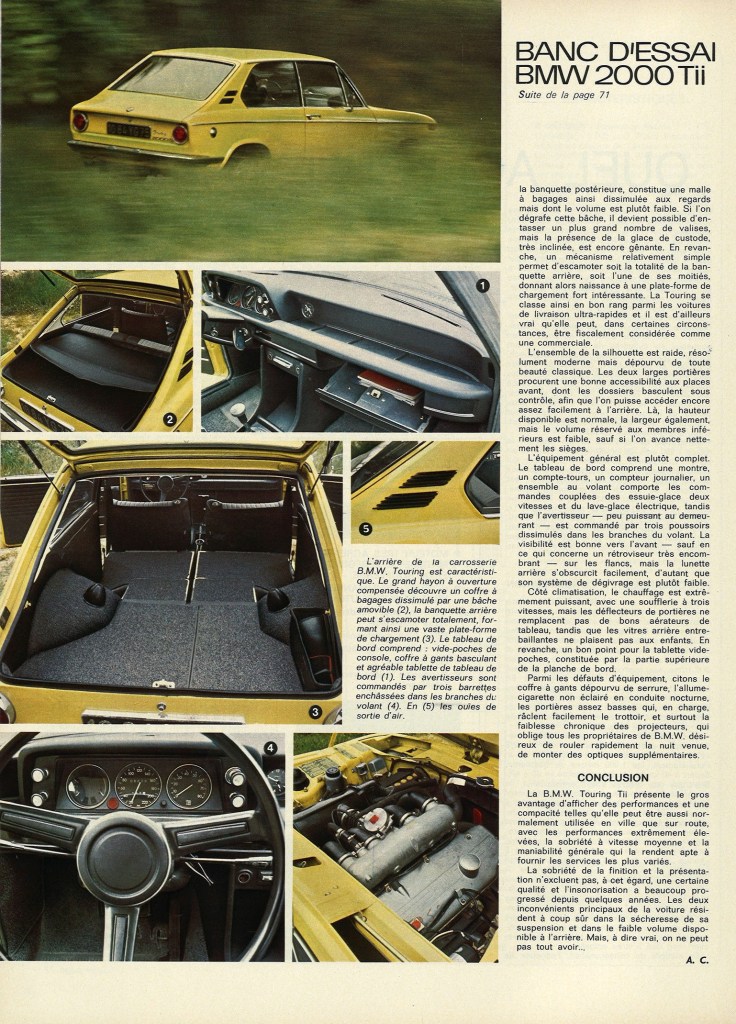 Voici quelques extraits de l’article signé André Costa : « Le groupe de la 2000 Tii est toujours le même. […] Toutefois, la puissance qui atteignait, avec deux carburateurs horizontaux double corps 120 ch DIN à 5500 tr/mn, est maintenant de 130 ch DIN au même régime. […] Sur l’anneau de Montlhéry, notre voiture d’essai a accompli son meilleur tour, le pilote étant seul à bord, en 50 s, ce qui correspond à 183,4 km/h. […] Bien que ces chiffres soient satisfaisants, ils s’avèrent impuissants à traduire l’agrément d’utilisation de ce moteur qui, par rapport à l’ancien 120 ch, possède un souffle et une endurance extrêmement séduisants. […] Les BMW possèdent depuis longtemps une bonne réputation en matière de tenue de route et la Touring ne nous parait pas faire exception à cette règle. […] Il est certain qu’avec la puissance et le couple disponible du moteur à injection, l’adhérence des roues motrices n’est pas considérable sur sol glissant. Il est d’ailleurs possible, contre supplément, de monter un pont autobloquant dont l’adjonction doit exercer une heureuse influence sur la facilité de contrôle du véhicule. […] Par rapport à l’ancienne caisse, le carrossier italien Touring a laissé la proue pratiquement inchangée, réservant ses efforts à la moitié postérieure qui, suivant la mode actuelle, a été transformée en une sorte de break doté d’un grand hayon — bruyant, hélas ! – s’ouvrant verticalement de haut en bas. Une bâche souple, tendue à l’horizontale derrière la banquette postérieure, constitue une malle à bagages ainsi dissimulée aux regards mais dont le volume est plutôt faible. Si l’on dégrafe cette bâche, il devient possible d’entasser un plus grand nombre de valises, mais la présence de la glace de custode, très inclinée, est encore gênante. En revanche, un mécanisme relativement simple permet d’escamoter soit la totalité de la banquette arrière, soit l’une de ses moitiés, donnant alors naissance à une plate-forme de chargement fort intéressante. […] L’ensemble de la silhouette est raide, résolument moderne mais dépourvu de toute beauté classique. ».