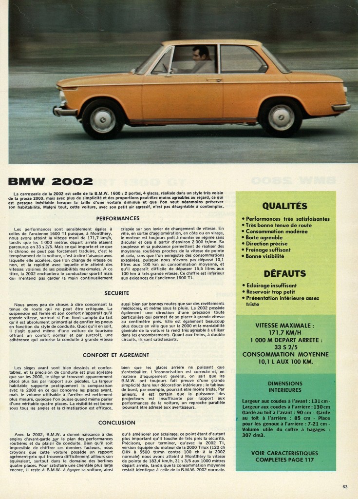 C’est à nouveau José Rosinski qui prend le volant de la dernière-née pour le numéro 84 du magazine Sport Auto publié en janvier 1969 : « La 2002 Ti est le mariage d’une caisse de 1600-2 avec le moteur animant jusqu’ici la plus grosse 2000 Ti-Tilux. […] La 2002 Ti offre maintenant 120 cv DIN. […] La seule différence importante avec la 1600 Ti que nous avons essayée dans le n° 74 de « Sport-Auto », concerne la mécanique. […] A tous égards, il apparait impossible de distinguer 1600 et 2002 Ti, sinon par les monogrammes figurant sur la calandre (peinte en noir mat pour ces deux modèles les plus sportifs) et sur le tableau arrière. Vous connaissez tous maintenant l’aspect sobre, net, presque clinique de la carrosserie Jubilé, je crois inutile d’y revenir. […] La visibilité à bord est remarquable sous tous les angles, on domine la route, et la position de conduite devrait satisfaire tout le monde. […] Tout de suite, on est frappé par l’exceptionnelle souplesse du moteur, qui se manifeste par des accélérations d’une énergie surprenante à bas régime. Le couple disponible est à tout moment évident, ce qui rend la conduite extrêmement agréable et décontractée, quelle que soit l’allure et le rapport engagé. […] Sur la grand-route ou l’autoroute, la voiture est d’une déconcertante facilité à conduire : elle suit fidèlement sa ligne de cap, s’inscrit sans broncher dans les courbes, ne roule pour ainsi dire pas, demeure parfaitement neutre. […] Toutes les commandes sont à bonne portée, levier de vitesses, pédalier, lave-glace, etc. Les freins, eux, demandent à être actionnés avec les plus grandes précautions, car leur assistance est très forte, et même excessive. […] Sur les petites routes tortueuses et escarpées du Massif Central, la maniabilité de la 2002 Ti est apparue tout à son avantage, mais un inconvénient n’a pas non plus tardé à se faire jour : en l’absence de différentiel autobloquant, et avec l’ensemble jantes-pneus de dimensions relativement modestes équipant la voiture d’origine, la tendance au patinage à la reprise est nettement exagérée. […] Comme il était facile de le prévoir, la BMW 2002 Ti est une voiture extrêmement agréable et d’un tempérament vraiment sportif, mais aussi fort civilisé. ».